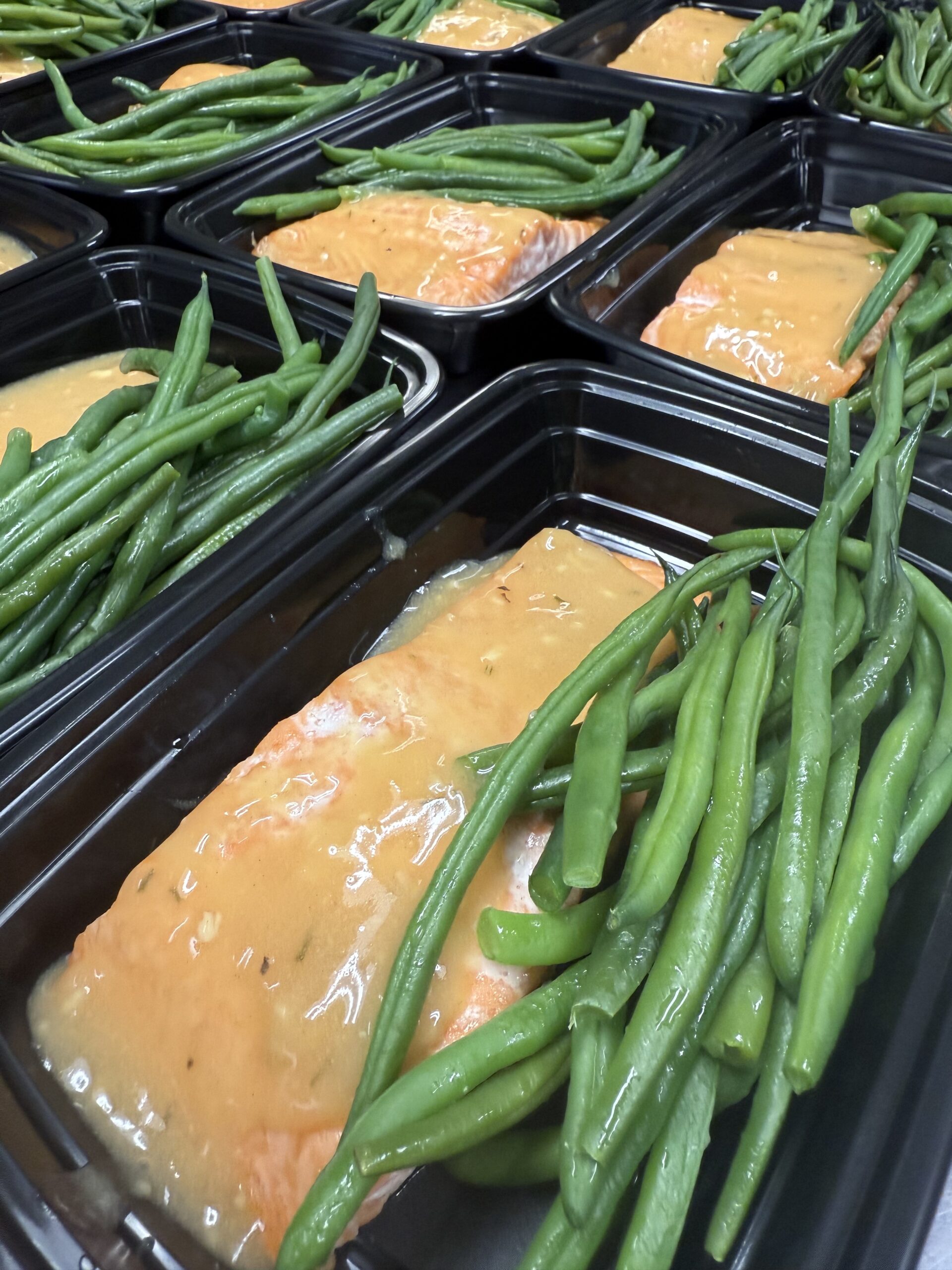 Salmon glazed with garlic, thyme, dijon, maple, and apple cider served with green beans (500 calories)