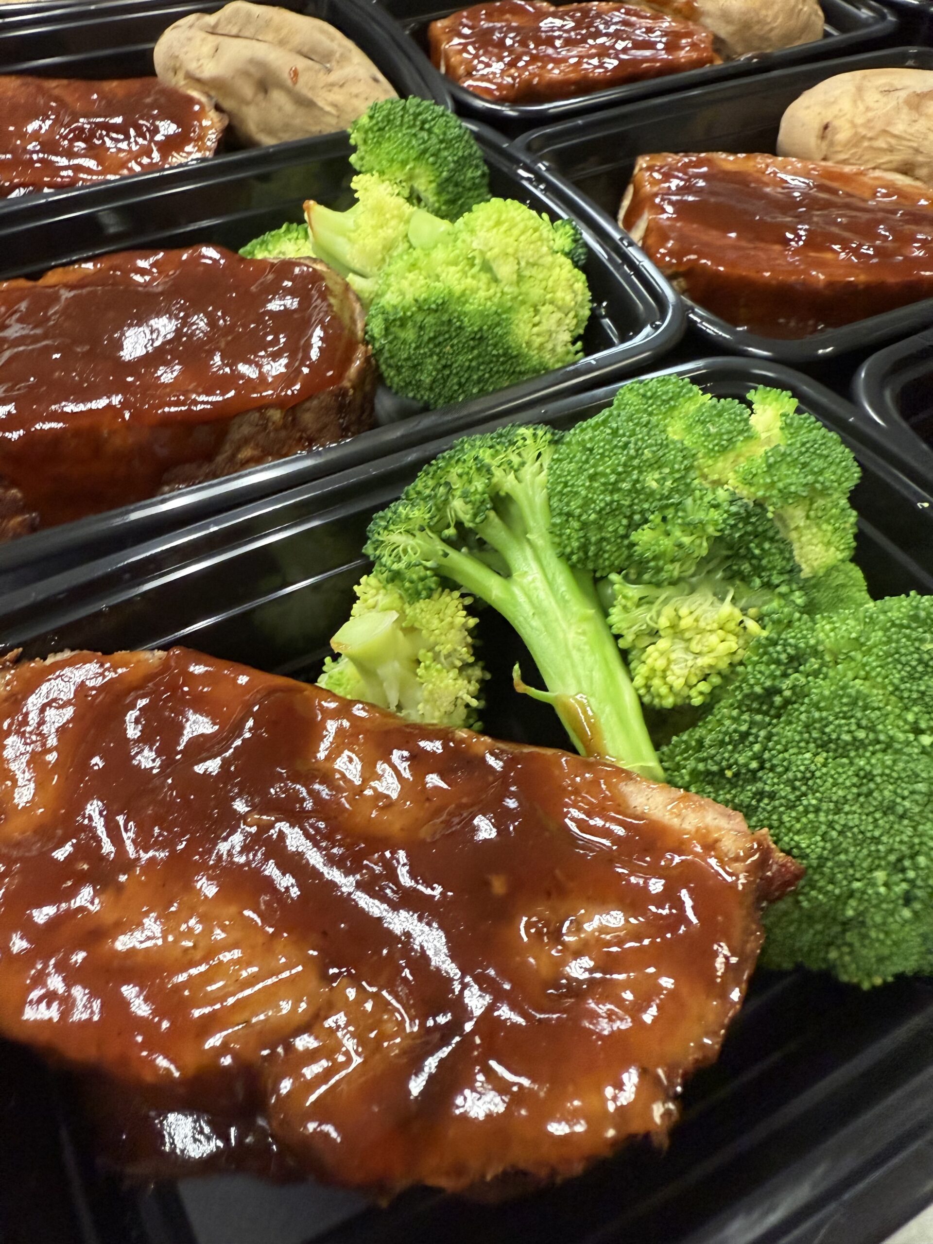 Turkey Meatloaf topped with bbq sauce and side broccoli. (550 calories)