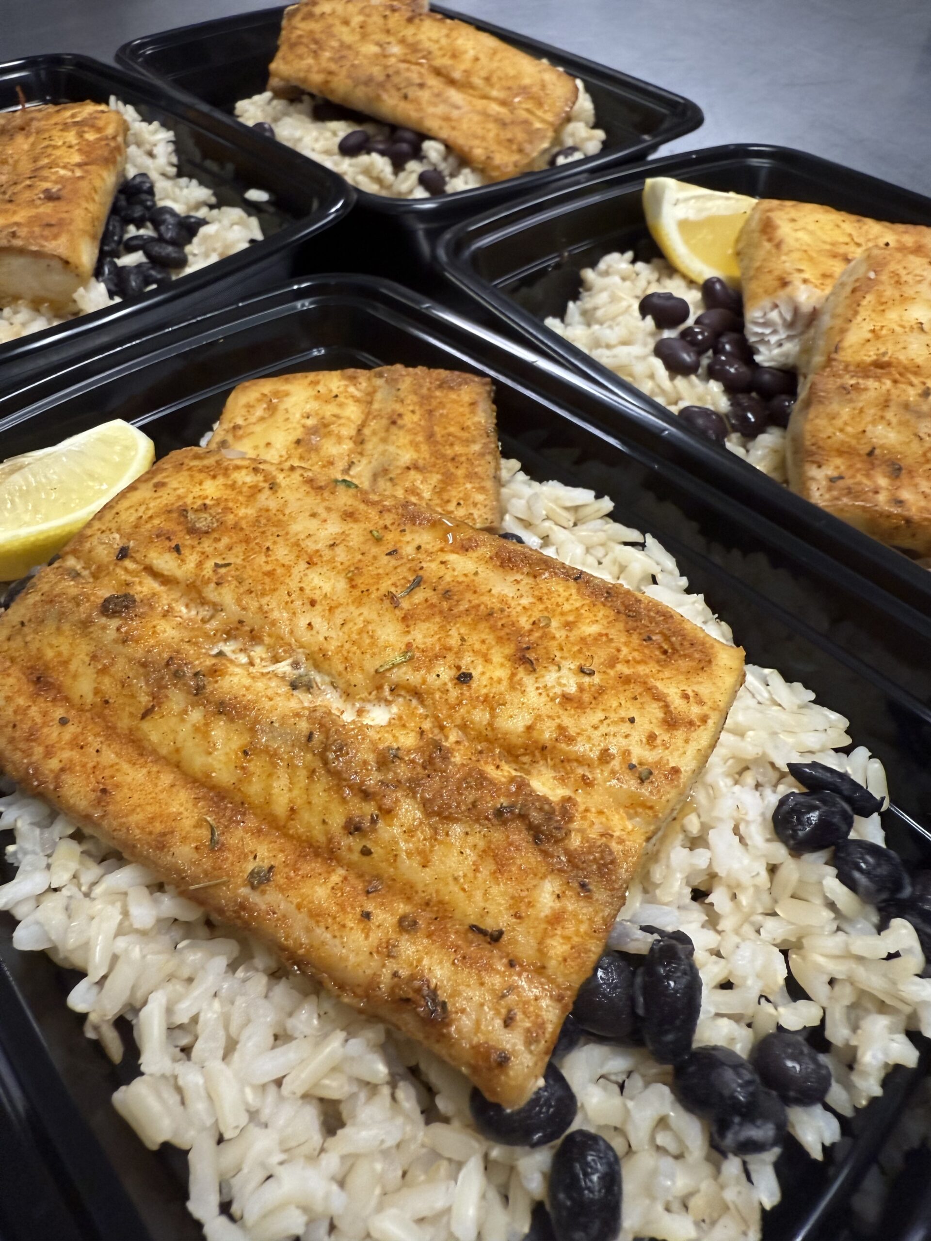 Wild Caught Blackened seasoned mahi mahi served with lemon wedge black beans and Brown rice. (450 calories)