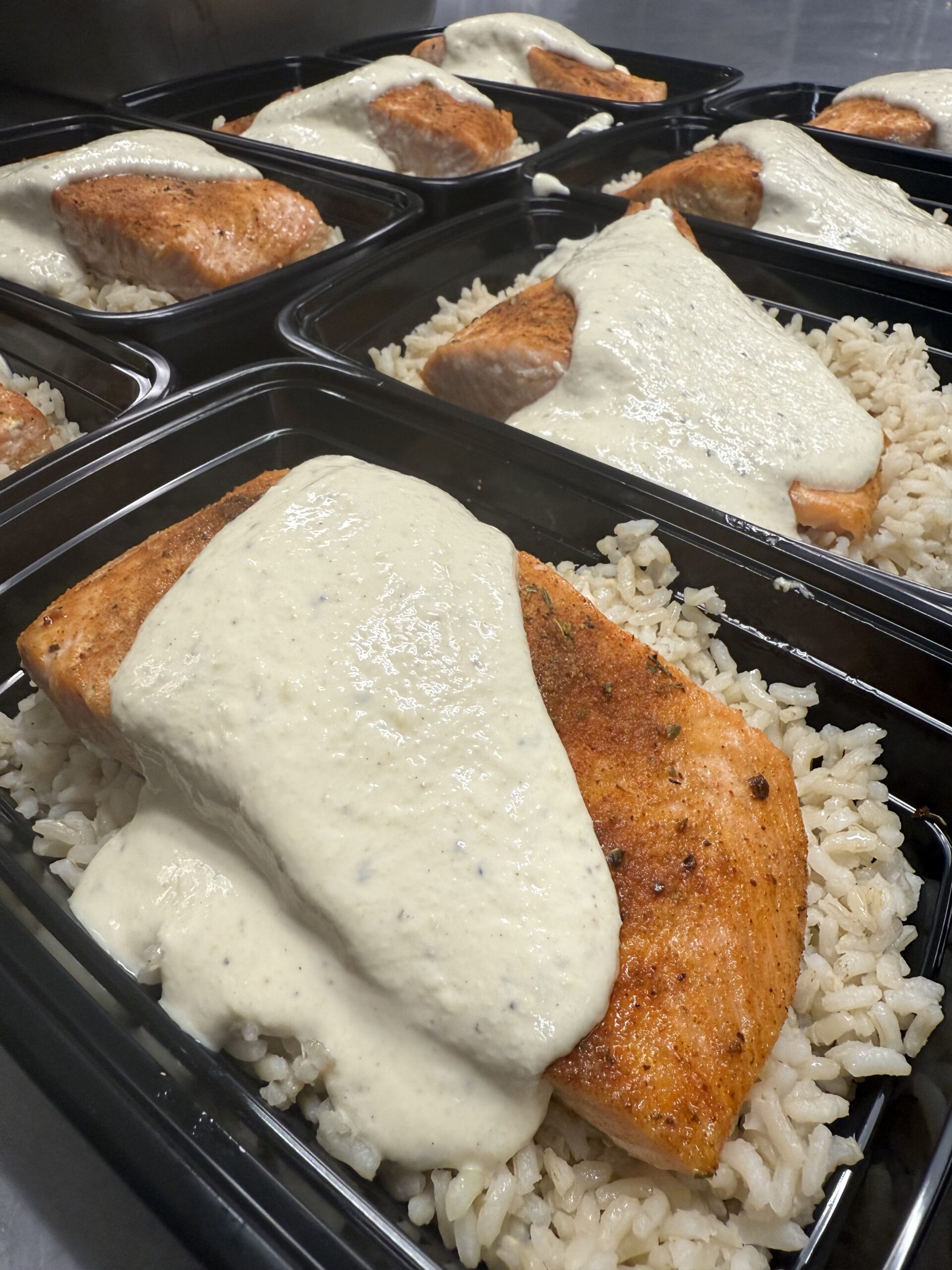Blackened Salmon filet topped with creamy Dijon sauce (greek yogurt, dijon, lemon juice, honey, garlic powder, black pepper) and served over brown rice. (550 calories)