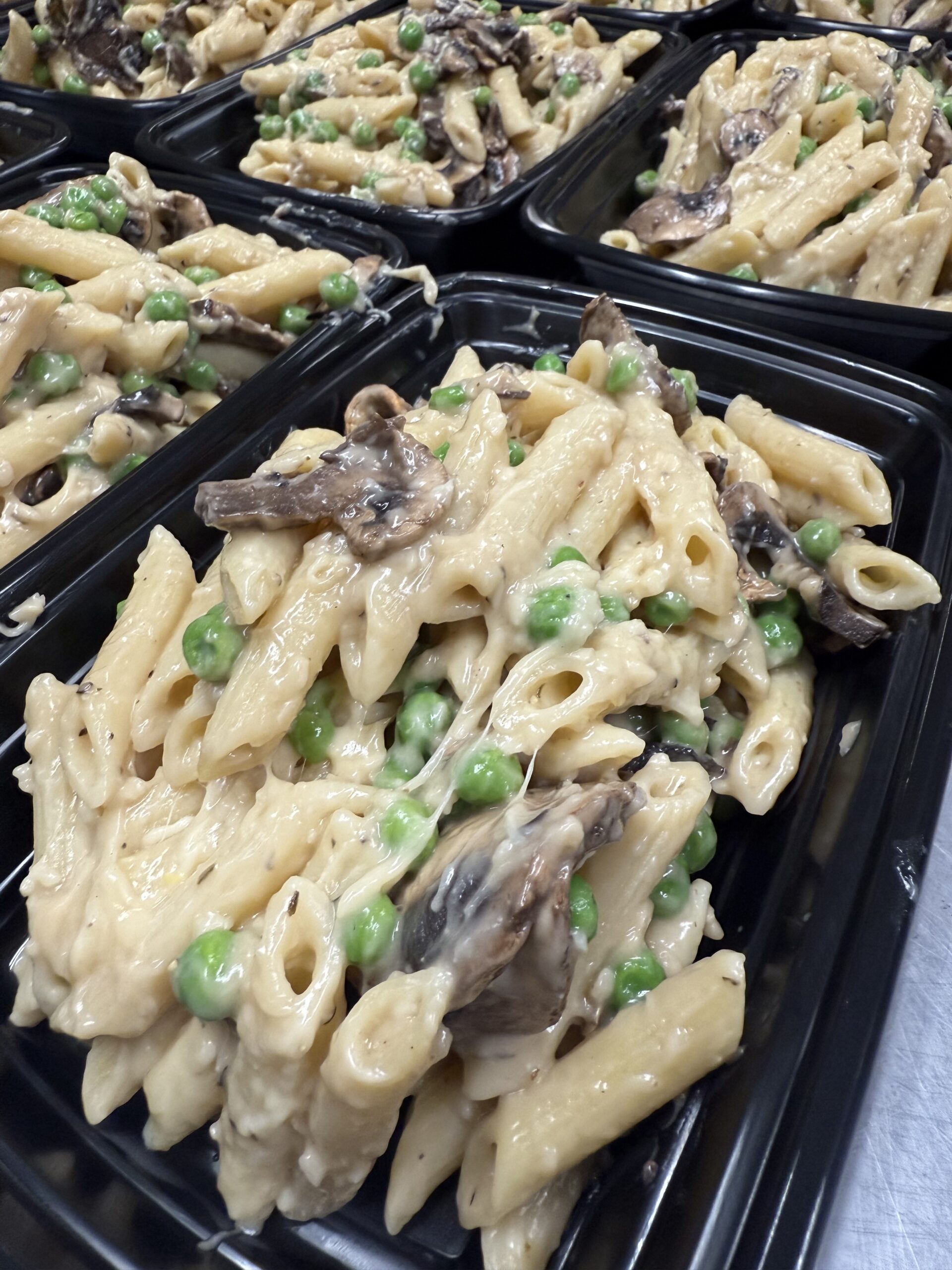 Mushrooms, peas, garlic, thyme, lemon juice, white miso pasta, penne, black pepper, olive oil, butter, parmesan cheese and touch of cream. (550 calories)