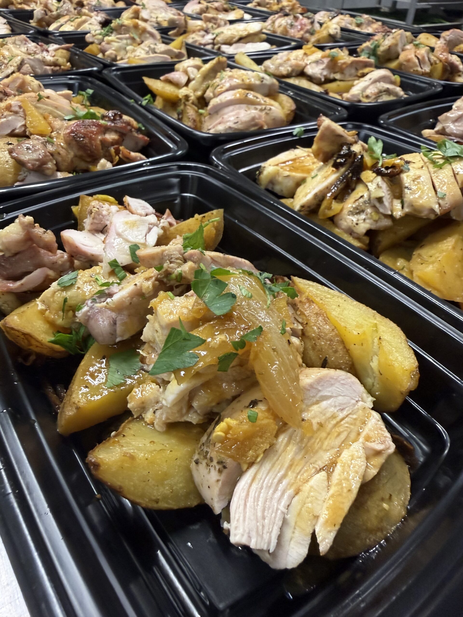 Chicken thighs roasted over white potatoes, banana peppers, garlic and onion, Italian seasoning, salt and pepper. (600 calories)